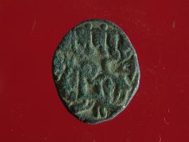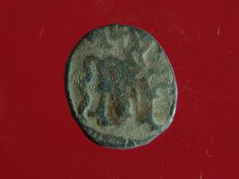 | Description / विवरण | It is a coin made of copper. The depression on obverse side depicts a deity sitting on a horse and holding a spear in his right hand. On reverse side bull in a sitting position. Shape is circular. Surface is smooth. Appearance is metallic bronze. |