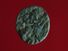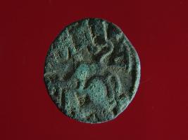 | Description / विवरण | It is a coin made of copper. The depression on obverse side depicts a deity sitting on a horse and holding a spear in his right hand. On reverse side bull in a sitting position. Shape is circular. Surface is smooth. Appearance is metallic bronze. |