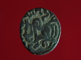 | Description / विवरण | It is a coin made of copper. The depression on obverse side depicts a deity sitting on a horse and holding a spear in his right hand. On reverse side bull in a sitting position. Shape is circular. Surface is smooth. Appearance is metallic bronze. |