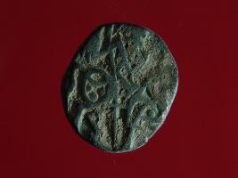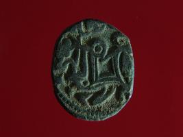 | Description / विवरण | It is a coin made of copper. The depression on obverse side depicts a deity sitting on a horse and holding a spear in his right hand. On reverse side bull in a sitting position. Shape is circular. Surface is smooth. Appearance is metallic bronze. |