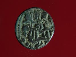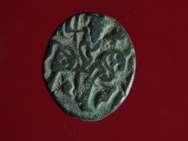 | Description / विवरण | It is a coin made of copper. The depression on obverse side depicts a deity sitting on a horse and holding a spear in his right hand. On reverse side bull in a sitting position. Shape is circular. Surface is smooth. Appearance is metallic bronze. |