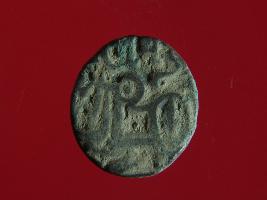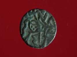 | Description / विवरण | It is a coin made of copper. The depression on obverse side depicts a deity sitting on a horse and holding a spear in his right hand. On reverse side bull in a sitting position. Shape is circular. Surface is smooth. Appearance is metallic bronze. |
