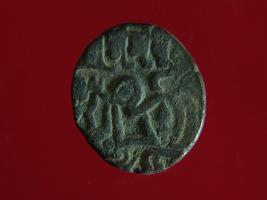 | Description / विवरण | It is a coin made of copper. The depression on obverse side depicts a deity sitting on a horse and holding a spear in his right hand. On reverse side is fade. Shape is circular. Surface is smooth. Appearance is metallic bronze. |
