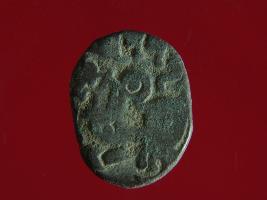 | Description / विवरण | It is a coin made of copper. The depression on obverse side depicts a deity sitting on a horse and holding a spear in his right hand. On reverse side bull in a sitting position. Shape is circular. Surface is smooth. Appearance is metallic bronze. |
