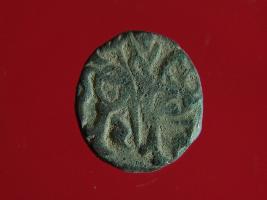 | Description / विवरण | It is a coin made of copper. The depression on obverse side depicts a deity sitting on a horse and holding a spear in his right hand and on reverse side a bull in a sitting position. Shape is circular. Surface is smooth. Appearance is metalic bronze. Hard patina deposited on it. |