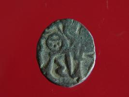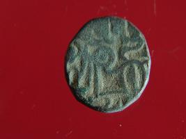 | Description / विवरण | It is a coin made of copper. The depression on obverse side depicts a deity sitting on a horse and holding a spear in his right hand and on reverse side a bull in a sitting position. Shape is circular. Surface is smooth. Appearance is metalic bronze. Hard patina deposited on it. |