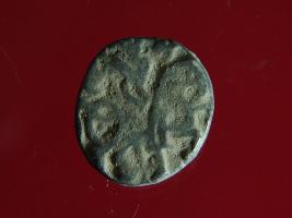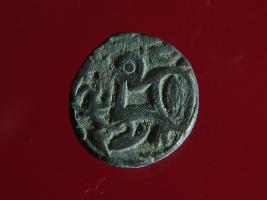 | Description / विवरण | It is a coin made of copper. The depression on obverse side depicts a deity sitting on a horse and holding a spear in his right hand and on reverse side a bull in a sitting position. Shape is circular. Surface is smooth. Appearance is metalic bronze. Hard patina deposited on it. |