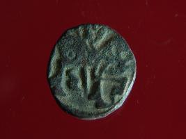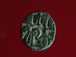 | Description / विवरण | It is a coin made of copper. The depression on obverse side depicts a deity sitting on a horse and holding a spear in his right hand and on reverse side a bull in a sitting position. Shape is circular. Surface is smooth. Appearance is metalic bronze. Hard patina deposited on it. |