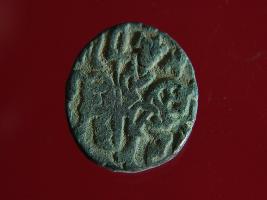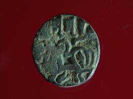 | Description / विवरण | It is a coin made of copper. The depression on obverse side depicts a deity sitting on a horse and holding a spear in his right hand and on reverse side a bull in a sitting position. Shape is circular. Surface is smooth. Appearance is metallic bronze. Hard patina deposited on it. |