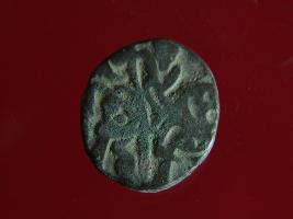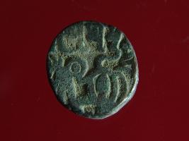 | Description / विवरण | It is a coin made of copper. The depression on obverse side depicts a deity sitting on a horse and holding a spear in his right hand and on reverse side a bull in a sitting position. Shape is circular. Surface is smooth. Appearance is metalic bronze. Hard patina deposited on it. |