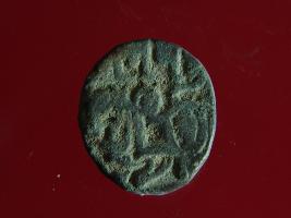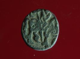 | Description / विवरण | It is a coin made of copper. The depression on obverse side depicts a deity sitting on a horse and holding a spear in his right hand and on reverse side a bull in a sitting position. Shape is circular. Surface is smooth. Appearance is metallic bronze. Hard patina deposited on it. |