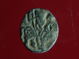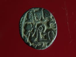 | Description / विवरण | It is a coin made of copper. The depression on obverse side depicts a deity sitting on a horse and holding a spear in his right hand and on reverse side a bull in a sitting position. Shape is circular. Surface is smooth. Appearance is metallic bronze. Hard patina deposited on it. |