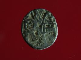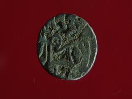 | Description / विवरण | It is a coin made of copper. The depression on obverse side depicts a deity sitting on a horse and holding a spear in his right hand and on reverse side a bull in a sitting position. Shape is circular. Surface is smooth. Appearance is metallic bronze. Hard patina deposited on it. |