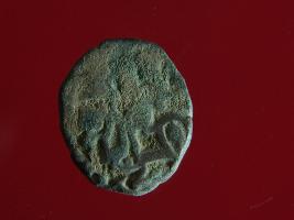 | Description / विवरण | It is a coin made of copper. The depression on obverse side depicts a deity sitting on a horse and holding a spear in his right hand and on reverse side a bull in a sitting position. Shape is circular. Surface is smooth. Appearance is metallic bronze. Hard patina deposited on it. |