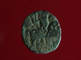 | Description / विवरण | It is a coin made of copper. The depression on obverse side depicts a deity sitting on a horse and holding a spear in his right hand and on reverse side a bull in a sitting position. Shape is circular. Surface is smooth. Appearance is metallic bronze. Hard patina deposited on it. |