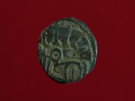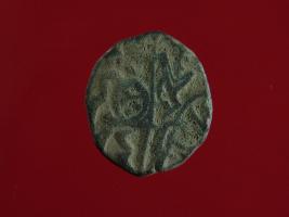 | Description / विवरण | It is a coin made of copper. The depression on obverse side depicts a deity sitting on a horse and holding a spear in his right hand and on reverse side a bull in a sitting position. Shape is circular. Surface is smooth. Appearance is metallic bronze. Hard patina deposited on it. |