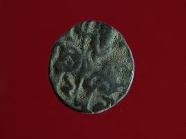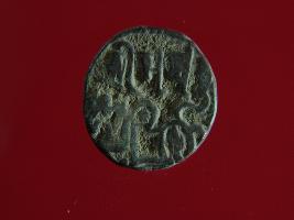 | Description / विवरण | It is a coin made of copper. The depression on obverse side depicts a deity sitting on a horse and holding a spear in his right hand and on reverse side a bull in a sitting position. Shape is circular. Surface is smooth. Appearance is metallic bronze. Hard patina deposited on it. |
