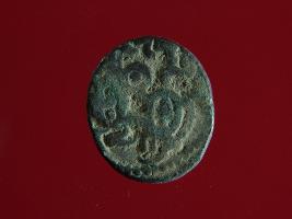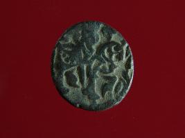 | Description / विवरण | It is a coin made of copper. The depression on obverse side depicts a deity sitting on a horse and holding a spear in his right hand and on reverse side a bull in a sitting position. Shape is circular. Surface is smooth. Appearance is greenish. Hard patina deposited on it. |