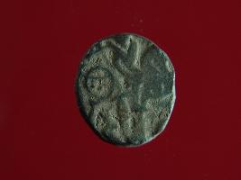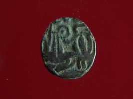 | Description / विवरण | It is a coin made of copper. The depression on obverse side depicts a deity sitting on a horse and holding a spear in his right hand and on reverse side a bull in a sitting position. Shape is circular. Surface is smooth. Appearance is greenish. Hard patina deposited on it. |