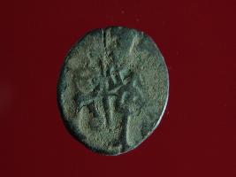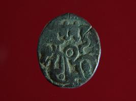 | Description / विवरण | It is a coin made of copper. The depression on obverse side depicts a deity sitting on a horse and holding a spear in his right hand and on reverse side a bull in a sitting position. Shape is circular. Surface is smooth. Appearance is greenish. Hard patina deposited on it. |