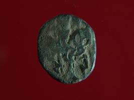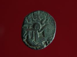 | Description / विवरण | It is a coin made of copper. The depression on obverse side depicts a deity sitting on a horse and holding a spear in his right hand and on reverse side a bull in a sitting position. Shape is circular. Surface is smooth. Appearance is greenish. Hard patina deposited on it. |