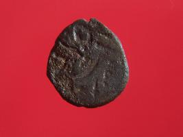 | Description / विवरण | Trench A, Layer 5 This is a small coin made of copper alloy. It has a standing human figurine on one side and the other side suggests a human figurine stands under a tree. Surface is smooth and colour is copper-brown. These coins were used as currency and for trade also. |