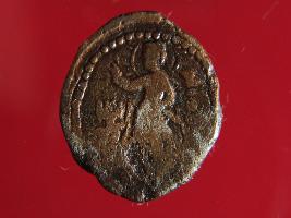 | Description / विवरण | It is a coin made of copper. The depression on obverse side depicts Shasti deity whose one hand is raised above other hand placed on waist and aura is also seen behind the head. Moreover bead pattern around it gives prominence to the character and devotees are also seen around it.Reverse side is fade. It is a treated coin. shape is circular and Surface is smooth with copper brown appearance. |