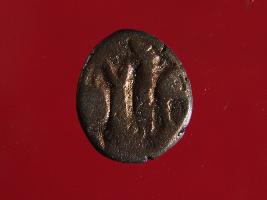 | Description / विवरण | It is a coin made of copper. The depression depicts on obverse side is a deity sitting on a bull and on reverse side is a standing human figurine. Shape is almost circular. Surface is smooth with copper brown appearance. |