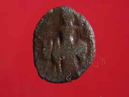 | Description / विवरण | Trench ZF-12, Pit 2 sealed by layer 1 This is a coin made of copper alloy. The relief on its obverse side suggests a standing figurine of Vasudeva. And the reverse side the relief suggests Shiva standing infornt of humped bull. Surface is uneven and colour is copper-brown. |