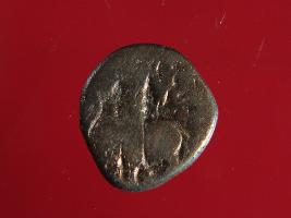 | Description / विवरण | It is a coin made of copper. The depression depicts on obverse side is a deity sitting on a bull and on reverse side is a standing human figurine. Shape is almost circular. Surface is smooth with copper brown appearance. |