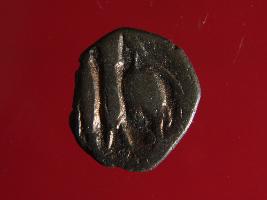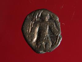 | Description / विवरण | It is a coin made of copper. The depression on obverse side depicts deity sitting on a bull. On reverse side there is standing human figurine. Shape is almost circular. Surface is rough. Appearance is copper brown. |