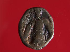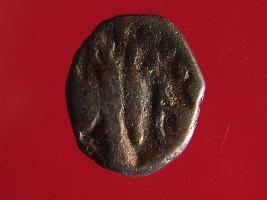 | Description / विवरण | It is a coin made of copper. The depression on obverse side depicts standing human figurine and on reverse side is faded. Shape is almost circular. Surface is rough with copper brown appearance. |
