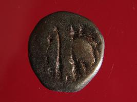 | Description / विवरण | It is a coin made of copper. The depression on obverse side depicts deity sitting on a bull. On reverse side there is standing human figurine. Shape is almost circular. Surface is rough. Appearance is copper brown. |