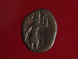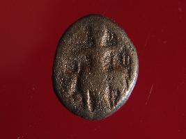 | Description / विवरण | It is a coin made of copper. The depression depicts on obverse side is a deity sitting on a bull and on reverse side is a standing human figurine. Shape is almost circular. Surface is smooth with copper brown appearance. |