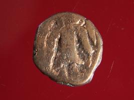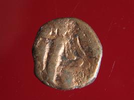| Description / विवरण | It is a coin made of copper. The depression depicts on obverse side is a deity sitting on a bull and on reverse side is a standing human figurine. Shape is almost circular. Surface is smooth with copper brown appearance. |