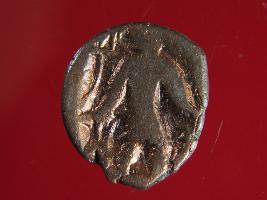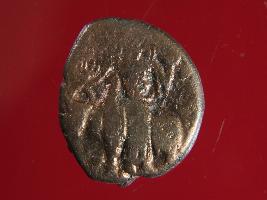 | Description / विवरण | It is a coin made of copper. The depression depicts on obverse side is a deity sitting on a bull and on reverse side is a standing human figurine. Shape is almost circular. Surface is smooth with copper brown appearance. |