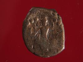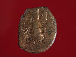 | Description / विवरण | It is a coin made of copper. The depression depicts on obverse side is a deity sitting on a bull and on reverse side is a standing human figurine. Shape is almost circular. Surface is smooth with copper brown appearance. |