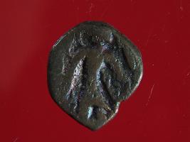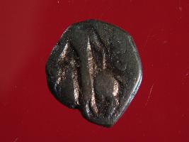 | Description / विवरण | It is a coin made of copper. The depression on obverse side depicts deity sitting on a bull. On reverse side there is standing human figurine. Shape is almost circular. Surface is rough. Appearance is copper brown. |
