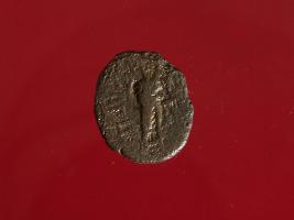 | Description / विवरण | This is a copper coin. The depression on obverse side depicts standing human figurine and reverse side image can not be identified. Shape is circular and surface is smooth. It is treated coin. Appearance is copper brown. |