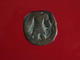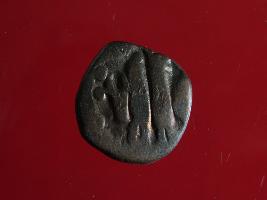 | Description / विवरण | It is a coin made of copper. The depression depicts on obverse side is a deity sitting on a bull and on reverse side is a standing human figurine may be of vasudeva. Shape is almost circular. Surface is smooth with copper brown appearance. |