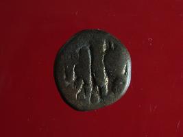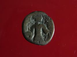 | Description / विवरण | It is a coin made of copper. The depression depicts on obverse side is a deity sitting on a bull and on reverse side is a standing human figurine may be of vasudeva. Shape is almost circular. Surface is smooth with copper brown appearance. |
