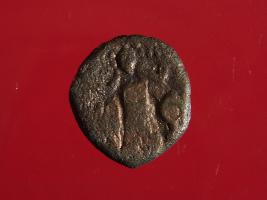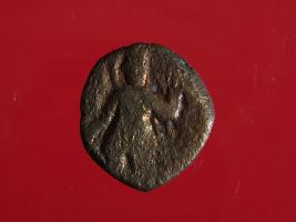 | Description / विवरण | It is a coin made of copper. The depression depicts on obverse side is a deity sitting on a bull and on reverse side is a standing human figurine may be of vasudeva. Shape is almost circular. Surface is smooth with copper brown appearance. |