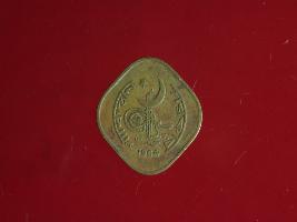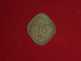 | Description / विवरण | It is a coin made of copper. On obverse side there is picture of a Ship and 5 is written on its flag. It also carries inscription. Reverse side shows a half moon with a star, also inscription is seen. It was issued in the year 1964. Shape is square and suface is smooth. |