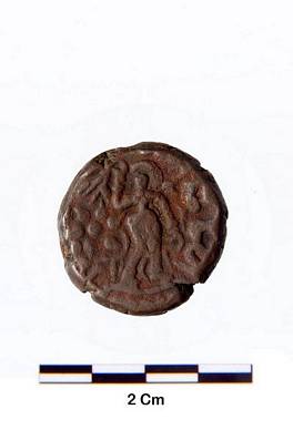 | Description / विवरण | Obverse- Standing female figure holding a twig in her upraised right hand. A flower is seen on the left symbols on the right indistinct. Reverse- Obliterated. |
