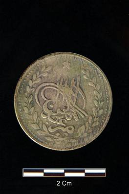 | Description / विवरण | Obverse Illegible Arabic legend star at the top creeper along the margin. Reverse Creeper along the border mosque in centre legend Kabul below it date 1312. |