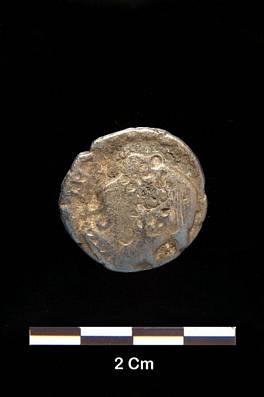 | Description / विवरण | Obverse Kshatrapa coin. Head of the king defaced. Reverse Fragmentary Brahmi legend sanas rajo .. , arched hill topped by crescent. |