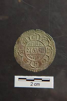 | Description / विवरण | Obverse Legend is squire having sun, moon, star and other ornaments outside, and around ornamental trident inside a circle in the centre - Sri Sri Sri Rajender Vikram Shah Dev below 1802. Reverse Legend written in eight potable lotus Sri Bhawani around dagger at four sides on the pericap , and Sri Sri Sri Gorakhnath one syllable each on eight petals . |
