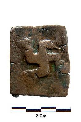 | Description / विवरण | Obverse- Swastika. Reverse- A circle surrounded by taurines and arrow heads. Highly blurred. |