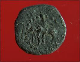 | Description / विवरण | Trench CZZ3-4, LxB-D 3.05 mts x 5.30 mts - 0.30 mts B.peg CZZ1 8, Stratum-layer 2 It s a punch marked metal coin made of copper alloy, black in colour, round disc like shape. It has a human figurine sitting on an animal on one side and some other design on other side. It was used as currency. |