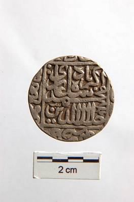 | Description / विवरण | Silver coin of Akbar Jaunpur mint. Obverse In a square, the Kalima . Margins on right, bottom and top cut. Left one bears Baadal Umar 967 date. Reverse From the bottom - Jalaluddin Muhammad Akbar Badshah Gazi. |